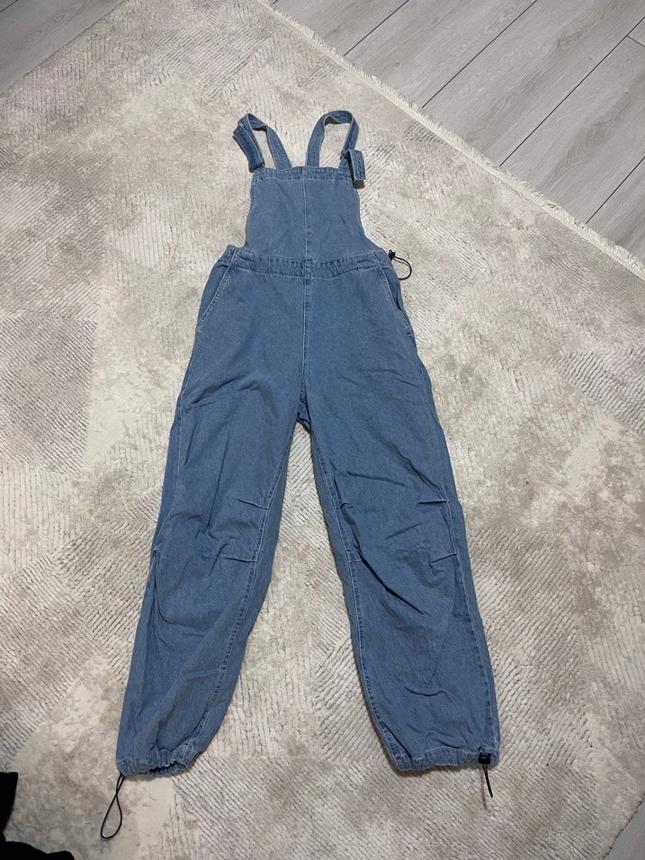 Lacivert denim, bol kesim, askılı halter yaka uzun tulum. Günlük rahat kullanım için midi boy, ayarlanabilir paça detaylı.