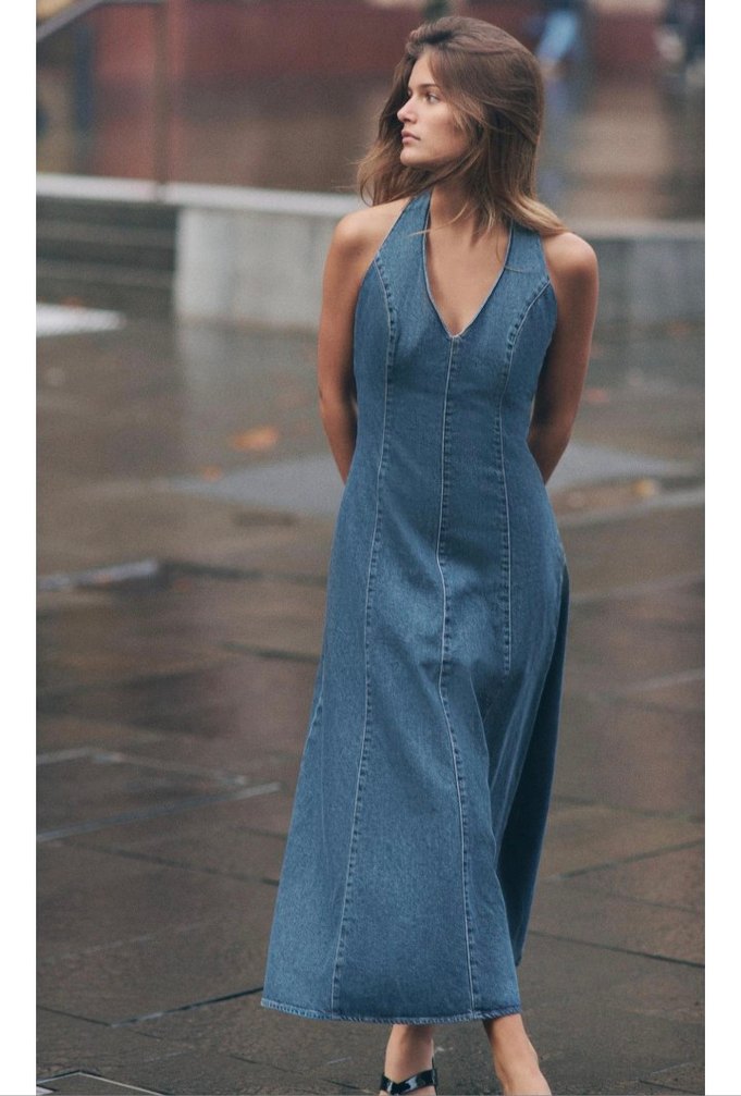 Kadınlar için, V yakalı, kolsuz ve dökümlü kesime sahip uzun denim elbise. Parlak lacivert renkte, günlük rahat sokak stili sunar.