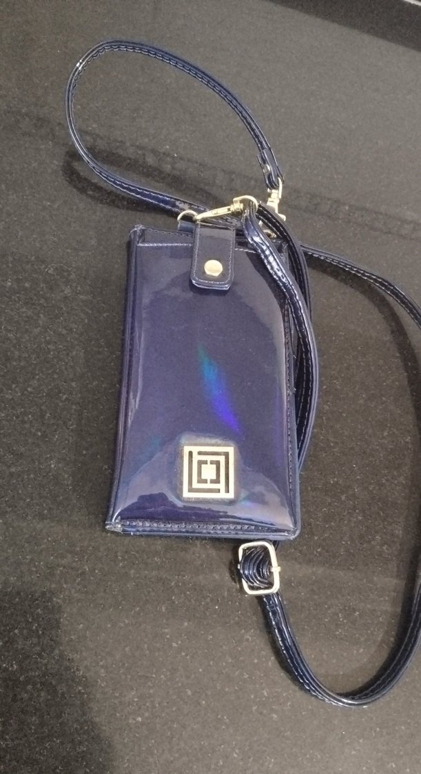 Lacivert deri, baskılı desenli, fermuarlı kadın çapraz çanta. Sokak modası ve iş stiline uygun, ayarlanabilir askılı.