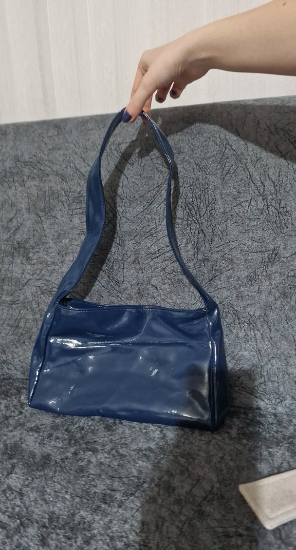 Lacivert deri kadın çantası, çıtçıtlı ve şık tasarımlı, günlük sokak stiline uygun, trend bir görünüm sunar.