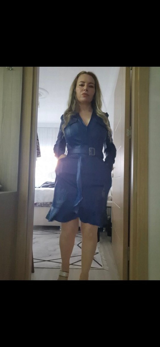 Bu kadın lacivert deri elbise, kemerli beli ve uzun kolları ile midi boyda, iş ve sokak stilini birleştirir. Trendsetterlar için ideal.
