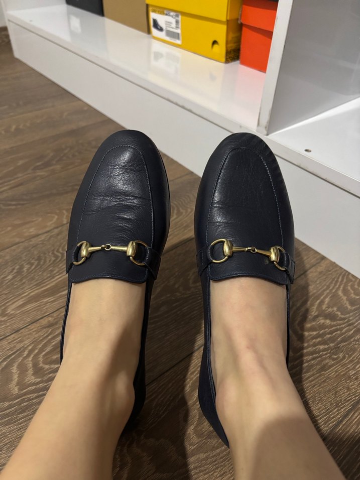 Koyu lacivert deri, tokalı ve kalın topuklu kadın loafer. Ofis ve günlük sokak stiline uygun.