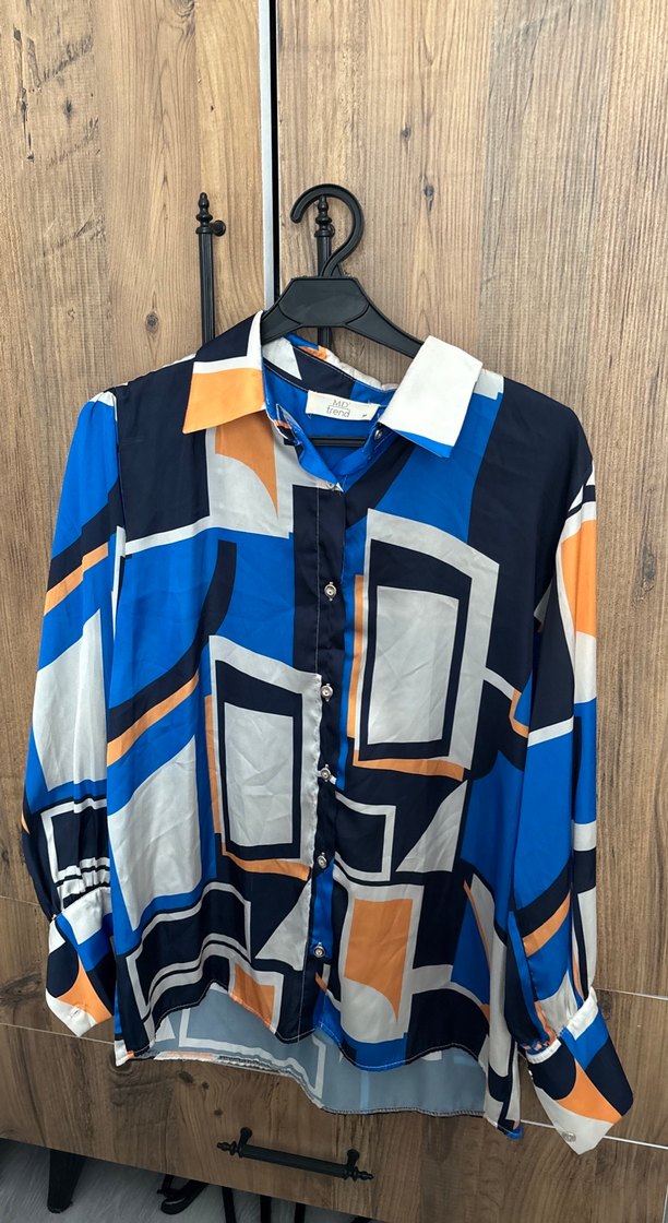Kadınlar için tasarlanmış, uzun kollu, yakalı ve düğmeli lacivert, turuncu ve beyaz geometrik desenli bol kesim gömlek. Günlük kullanım için sentetik kumaştan midi boy.