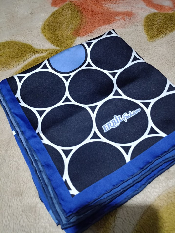 Yumuşak ve sıcak kumaştan, koyu mavi büyük daire desenli, kadın eşarp