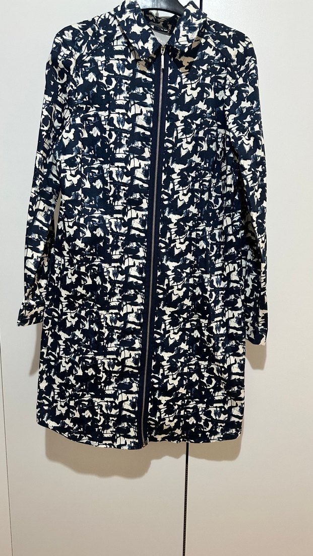 Kadınlar için uzun, bol kesim fermuarlı yağmurluk. Sentetik kumaştan yapılmış, lacivert desenli, notlu yaka detaylı, günlük kullanım ve sokak stiline uygun. ️