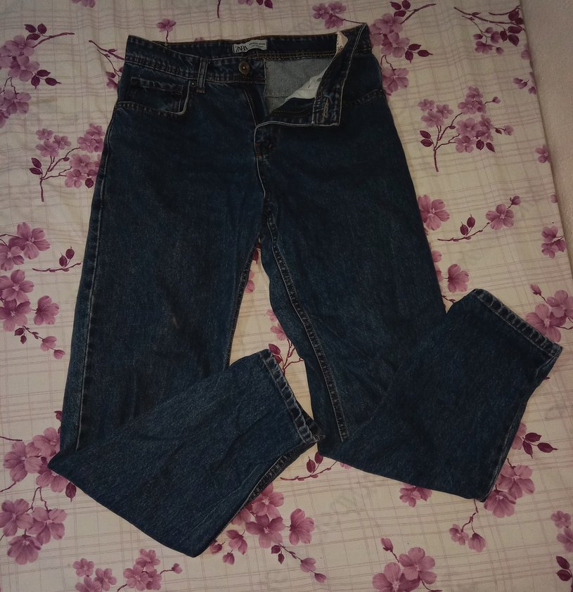 Kadınlar için tasarlanmış, düğmeli ön kısımlı, bol kesim lacivert kot pantolon. Normal midi boyda, günlük rahat sokak stili için uygun.