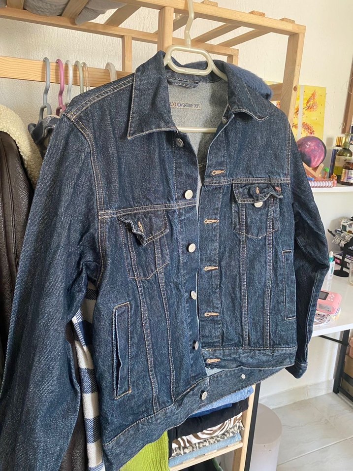 Lacivert düğmeli denim ceket, loose fit ve kesik yaka ile, uzun kollu ve günlük rahat kullanım için uygundur.
