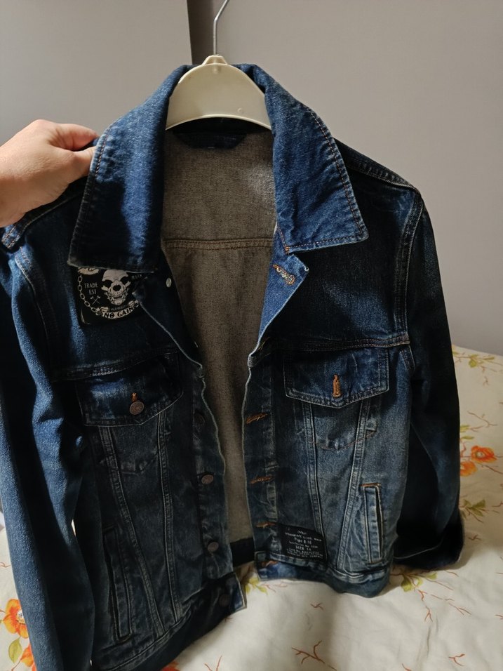 Lacivert düğmeli, bol kesim, yakalı uzun kollu denim ceket. Günlük kullanıma uygun rahat sokak stili.