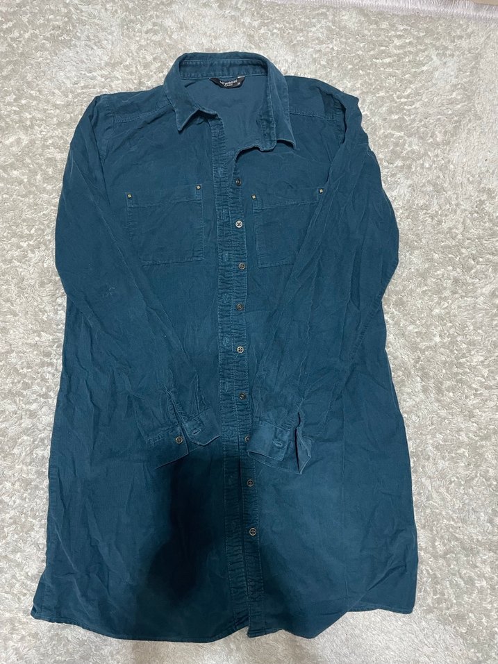 Lacivert düğmeli denim gömlek, uzun kollu ve yakalıdır. Salaş kesimiyle günlük rahat sokak stili için uygundur.