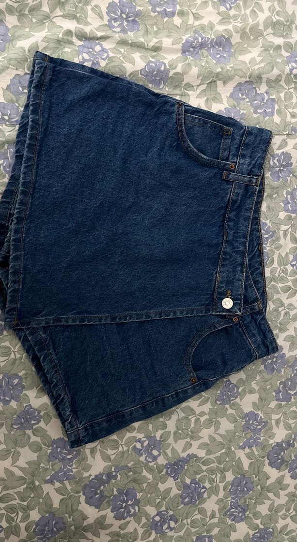 Kadınlar için lacivert renkte, düğmeli, bol kesim mini kot şort etek. Günlük rahat kullanım için uygundur.