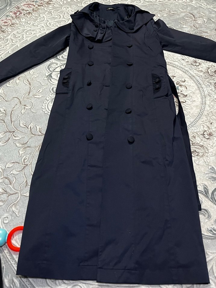 Lacivert uzun trençkot, yakası kesimli ve düğmeli ön tasarıma sahiptir. Uzun kollu, regular fit ve sentetik kumaştan üretilmiştir. Günlük gotik tarz için uygundur.