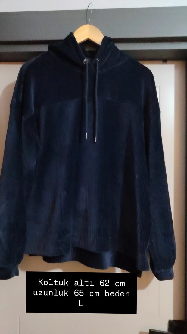 Lacivert, uzun kollu, düğmeli ve yüksek yakalı kadın sweatshirtü. Yumuşak ve sıcak kadife kumaştan, 65 cm uzunluğunda, koltuk altı genişliği 62 cm. Rahat kesim ve gündelik kullanım için uygundur.