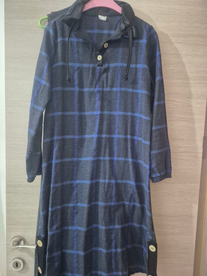 Lacivert ekose desenli, düğmeli, uzun kollu, bol kesim midi tunik. Yumuşak ve sıcak kumaştan, rahat ve şık sokak stili için uygun.
