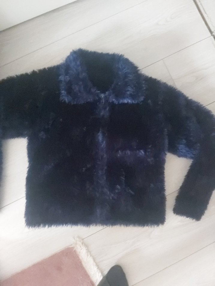 Kadınlar için uzun kollu, yakalı, sakallı iple örülmüş, lacivert önden fermuarlı kürk gibi mont. Çok güzel, prıl prıl ve hiçbir kusuru yoktur.