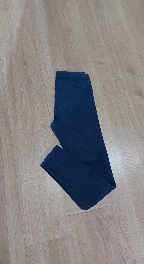 Kadınlar için lacivert elastik denimden, normal paça ve düz desensiz, günlük kullanıma uygun rahat kesim jean.