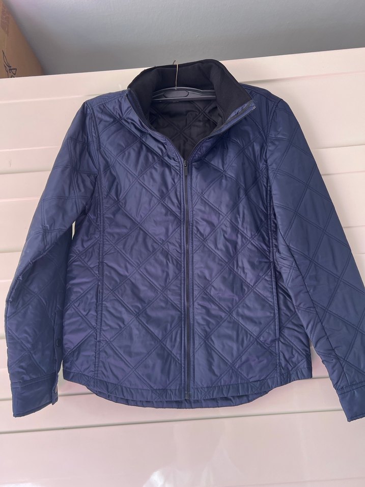Lacivert kadın ceketi, yüksek yakalı ve uzun kolludur. Fermuarlı, normal kesim ve yumuşak, sıcak kumaştan yapılmıştır, günlük sokak stiline uygundur.