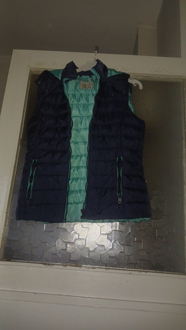 Kadınlar için fermuarlı, yüksek yakalı ve kolsuz, sentetik kumaştan yapılmış lacivert midi yelek. Rahat ve günlük kullanıma uygun.