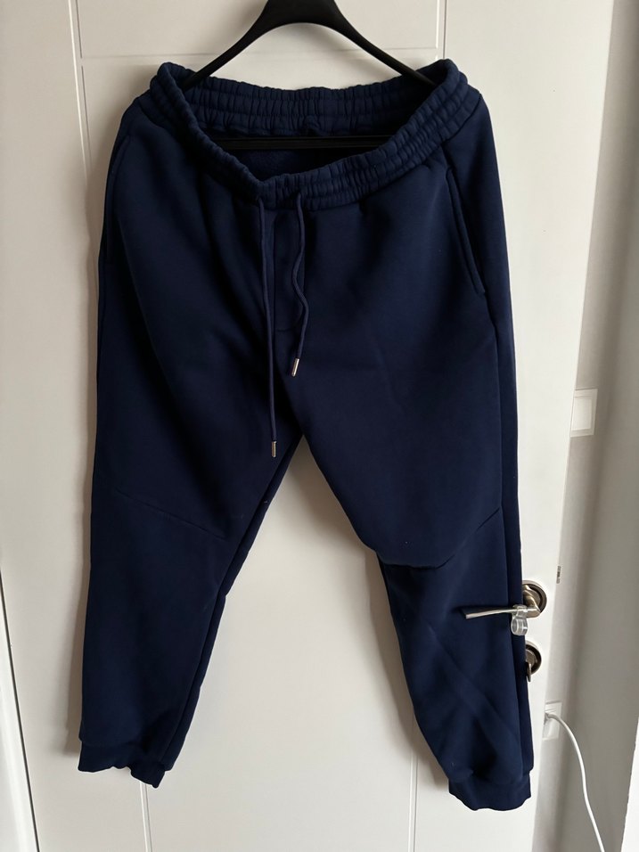 Lacivert, fermuarlı cepleri olan bol kesim kadın eşofman altı. Yumuşak, sıcak kumaştan, günlük kullanım için uygundur.