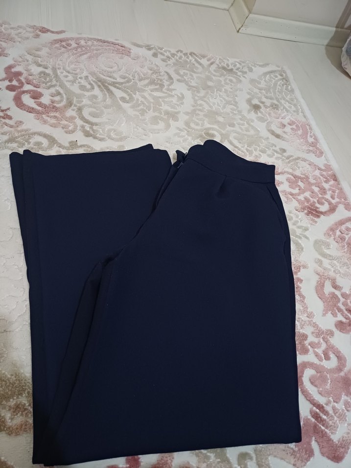 Kadınlar için tasarlanmış, rahat kesim ve midi boy lacivert pantolon. Yumuşak ve sıcak kumaştan üretilmiş, fermuarlı cepleriyle şık ve rahat bir tarz sunar. Az kullanıldı, temizdir, hafif tüylenmeler vardır.