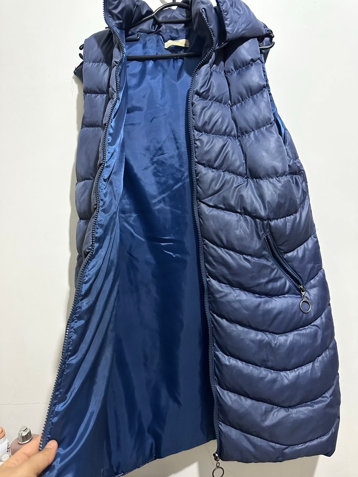 Fermuarlı, yüksek yakalı ve şişme tasarımlı kadın yeleği, yumuşak sentetik kumaştan, lacivert renkte. Kolsuz ve midi boyda, rahat sokak stili ve dış mekan kullanımı için uygun. 90 cm