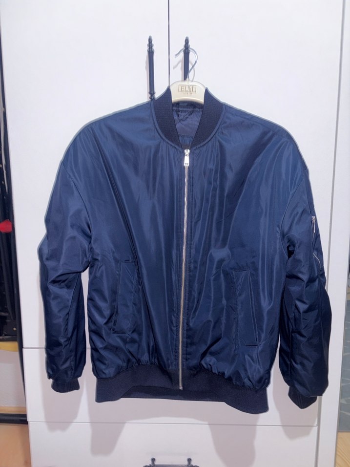 Kadın lacivert renkli, fermuarlı, uzun kollu, bisiklet yaka street wear cekettir. Normal kalıplı, parlak sentetik kumaştan, minimal desen içermeyen günlük kullanıma uygundur.