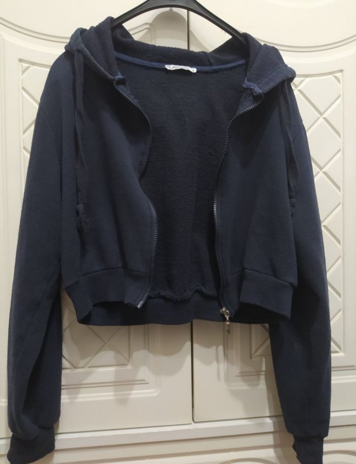 Kadınlar için koyu mavi, bol kesim, yüksek yakalı, uzun kollu ve fermuarlı crop sweatshirt. Yumuşak ve sıcak kumaştan üretilmiştir, gündelik kullanım için uygundur.