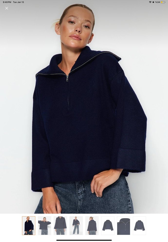 Kadınlar için tasarlanmış, lacivert renkte, uzun kollu ve yüksek yakalı fermuarlı denim kazak. Rahat kesimi ve midi uzunluğu günlük kullanıma uygundur.