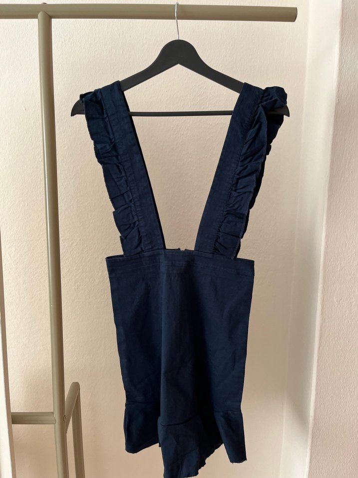 Lacivert renkte, rahat kesim midi denim salopet, V yaka ve fırfırlı askılarla günlük şıklık sunar.