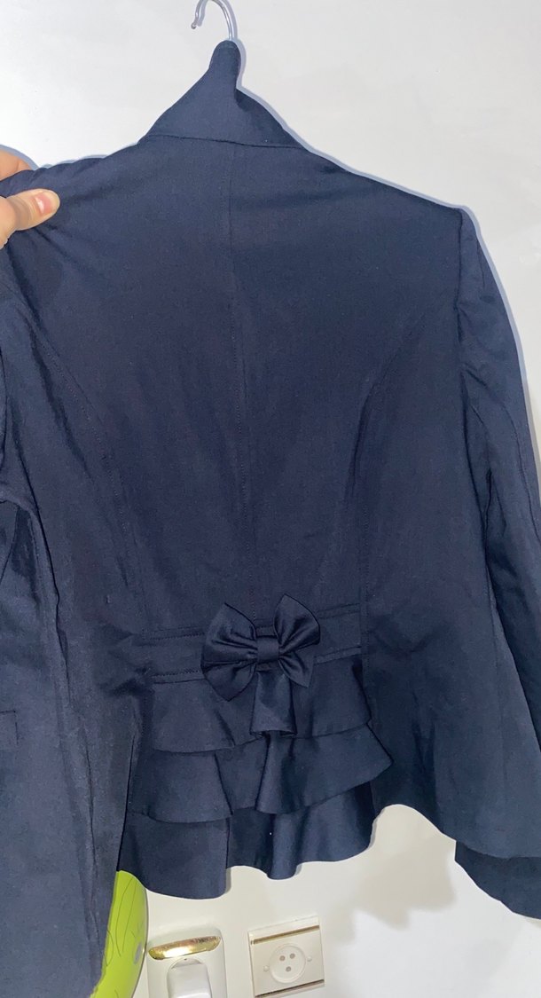 Fırfır detaylı, uzun kollu, normal boyda lacivert kadın blazer. İnce kesimi ve satenimsi dokusuyla klasik ve şık bir görünüm sunar. 36-38 beden