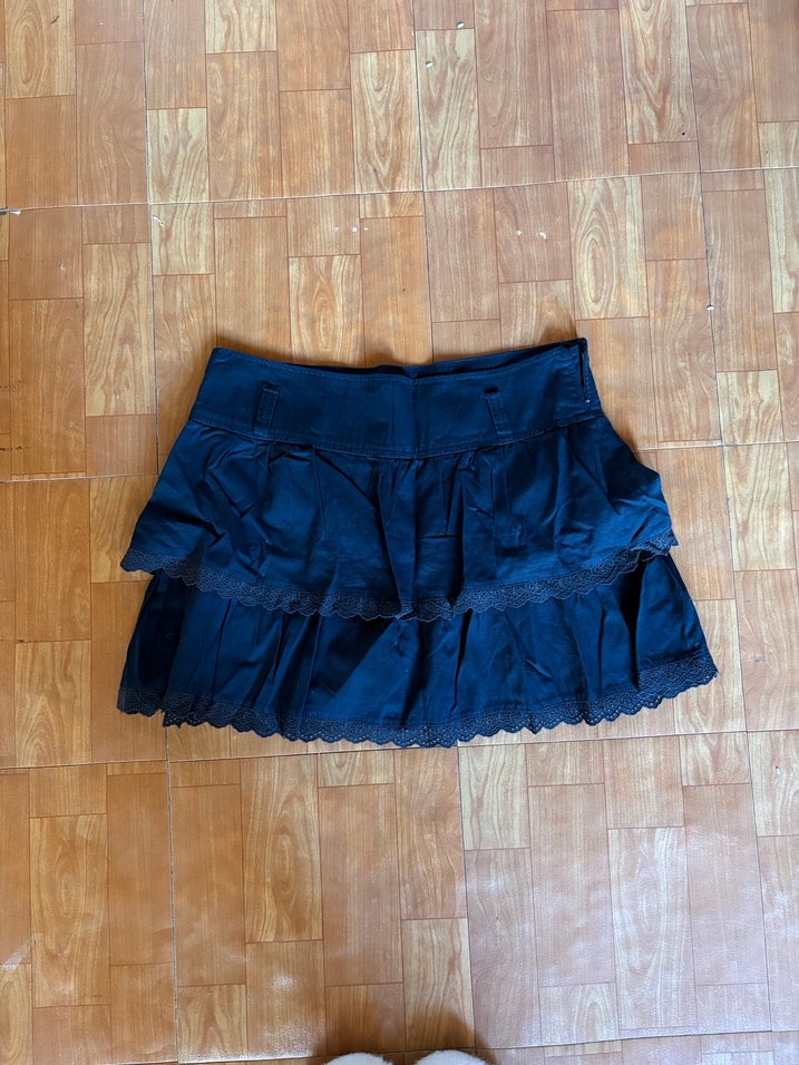 Lacivert midi boy fırfırlı denim etek, rahat kesimli ve desensiz. Gotik tarz ve romantik akşamlar için uygun.