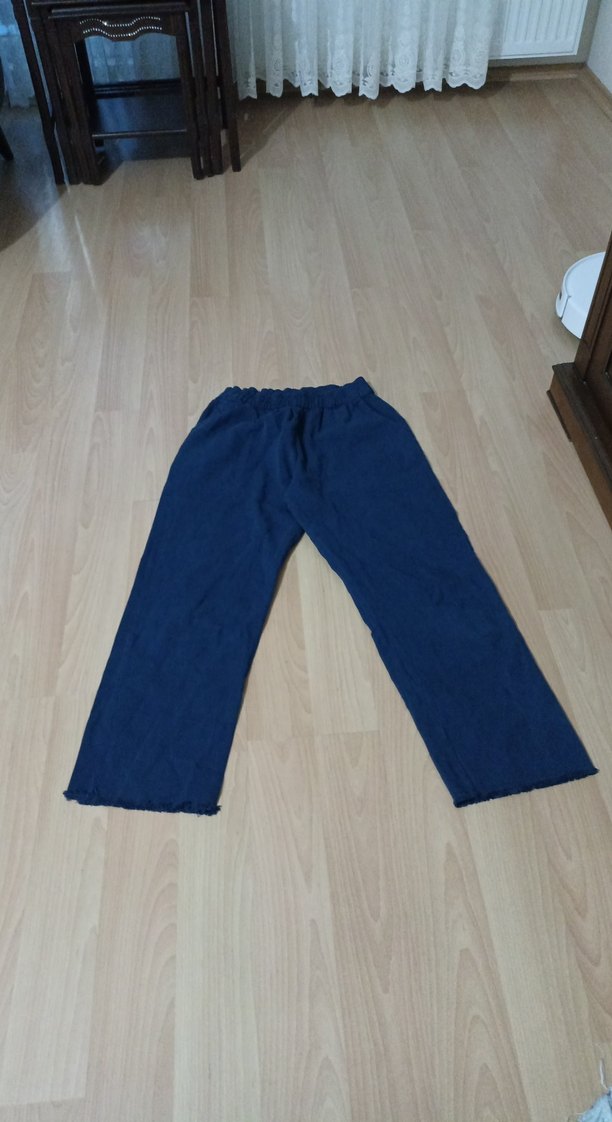 Lacivert denim kumaştan, bol kesim boy pantolon, günlük ve sade tarz için uygundur.