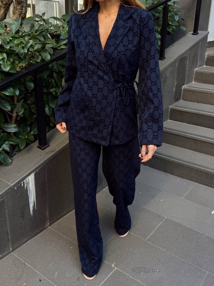 Kadınlar için lacivert yılan derisi desenli denim takım. Normal kesim, yakalı ve düğmeli. Strappy kollu, midi boy ve ofis kullanımı için uygun.