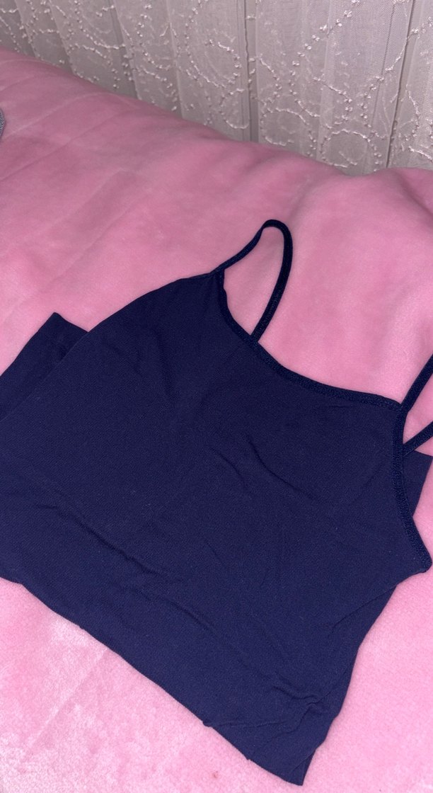 Lacivert ince askılı, düz yakalı, vücuda oturan kadın atlet. Pürüzsüz sentetik kumaştan üretilmiştir ve günlük kullanım için uygundur.