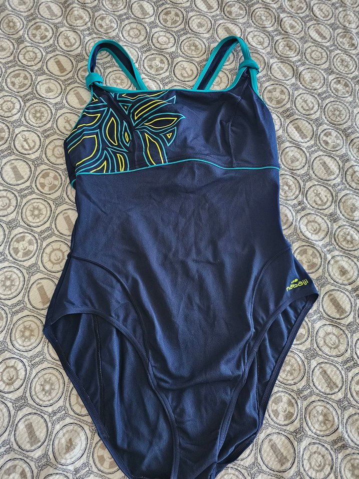 Kadınlar için ince askılı, elastik özellikli lacivert mayo. Tek tarafında yaprak desenli, plaj ve sokak tarzına uygun.