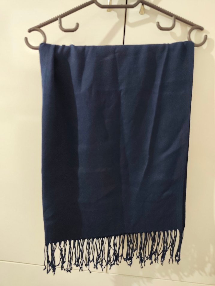 Kadınlar için lacivert renkte, ipek dokulu, drapeli ve püsküllü kenarları olan şal. Rahat ve bohem tarz için uygundur.