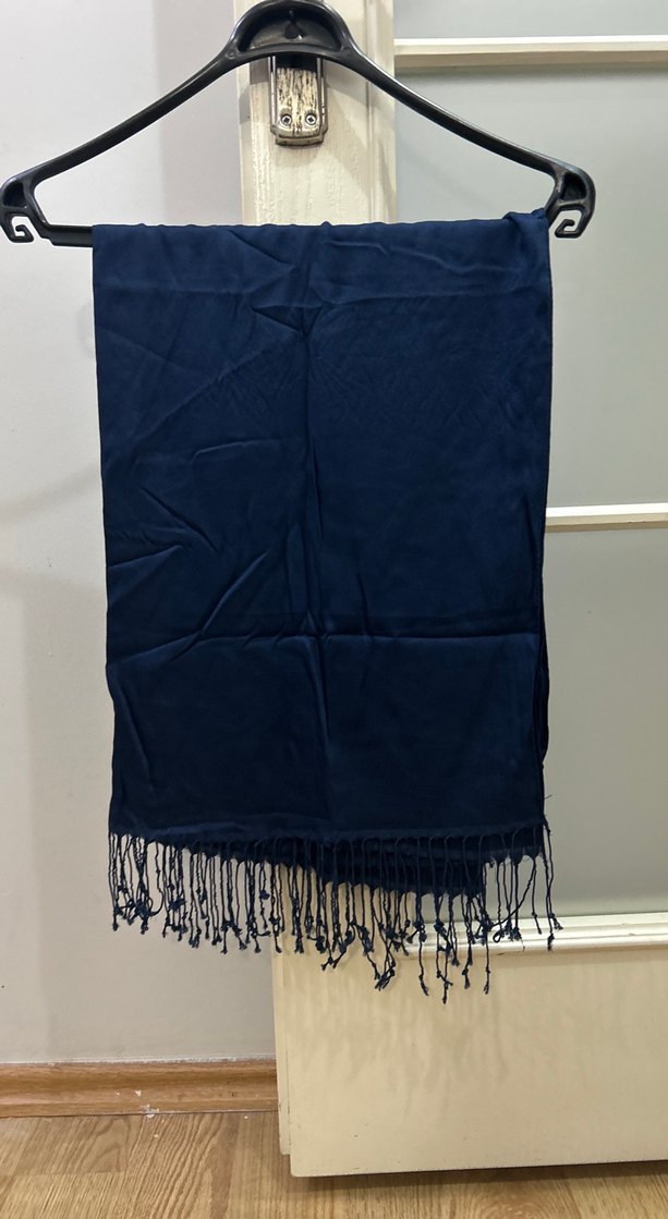 Kadınlar için ipek görünümlü, lacivert renkte, salaş drapeli şal. Kenarlarında ince püsküller bulunur.