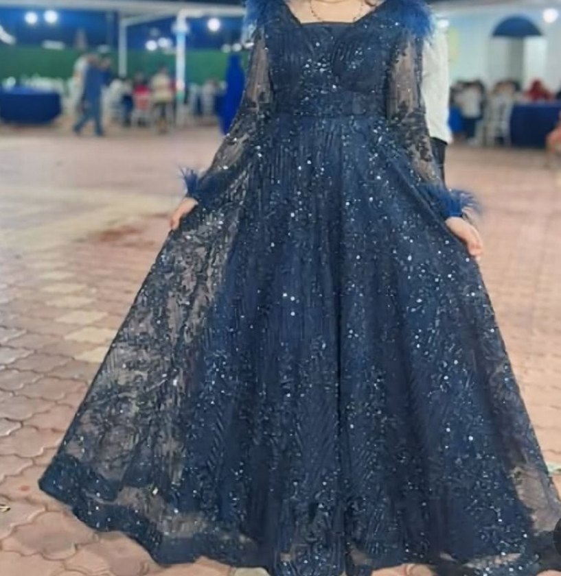 Lacivert işlemeli ve simli kumaştan, V yaka, uzun kollu, tüy detaylı, bohem tarzda, düğünlere uygun rahat kesim abiye elbise. ✨