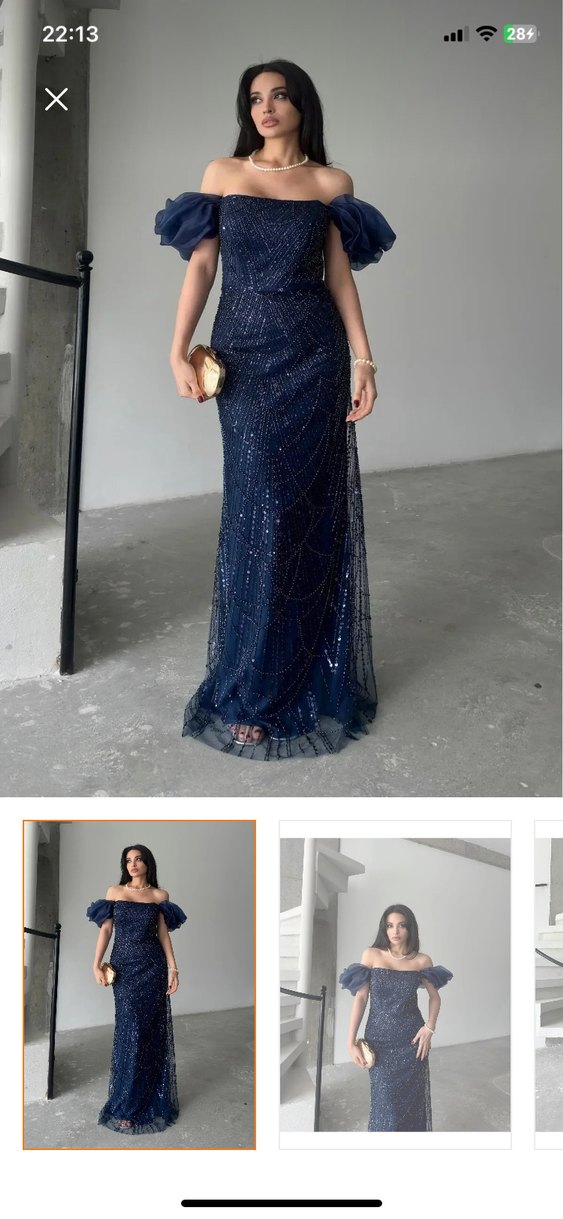 Lacivert rengi, işlemeli uzun abiye elbise, dar kesim, kayık yaka ve ince askılarla. Drapeli tasarımı ve detaylı işlemeleriyle düğün ve özel günlere uygun. ✨ 1.60 63 kilo L beden giydim bir kere giyildi