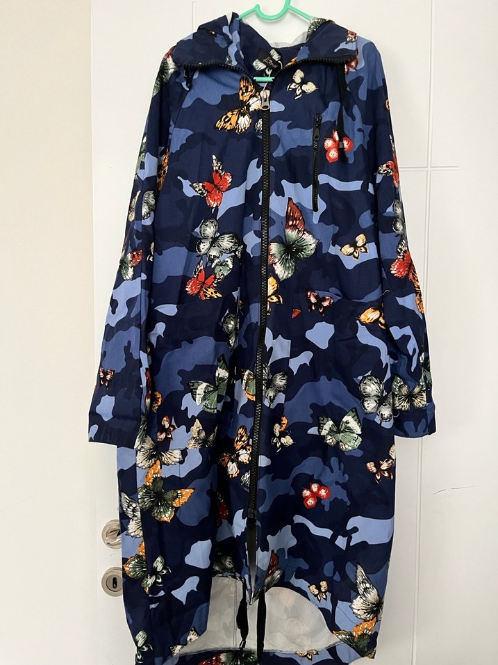 Kadınlar için uzun lacivert kamuflaj ve kelebek desenli yağmurluk. Gevşek kesim, çıtçıtlı yakalı, uzun kollu ve fermuarlı, günlük sokak stili için uygundur. Ürün göğüs ölçüsü 116 Boy 110 civarı .Ürün kapşonludur