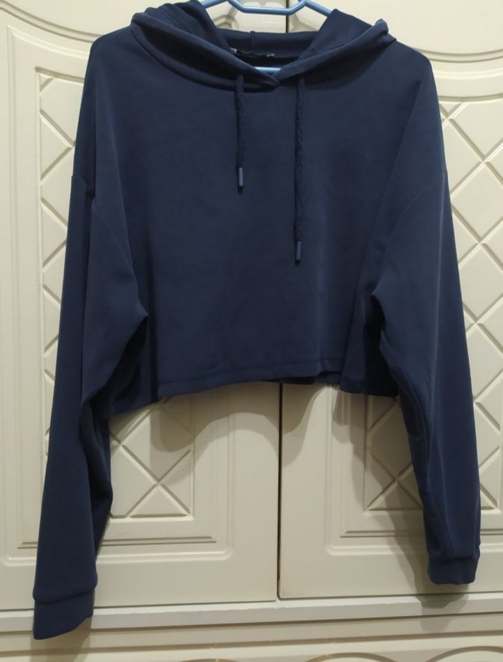 Kadınlar için uzun kollu, kapüşonlu ve bol kesim lacivert kapüşonlu sweatshirt. Yumuşak kumaştan, günlük rahat stil için uygun.