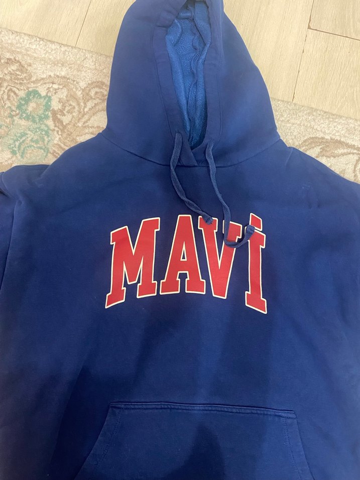 Lacivert kapüşonlu, uzun kollu, baskılı ve fermuarlı detaylı kadın sweatshirt. Spor ve günlük kullanıma uygun, vücuda oturan kesim. "MAVi" baskılı.