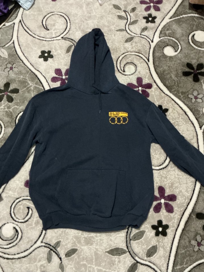 Lacivert kapüşonlu sweatshirt, bol kesim ve uzun kollu, yumuşak kumaştan. Ön cep ve göğüste küçük sarı baskı detayı bulunur. Spor tarz için uygun.