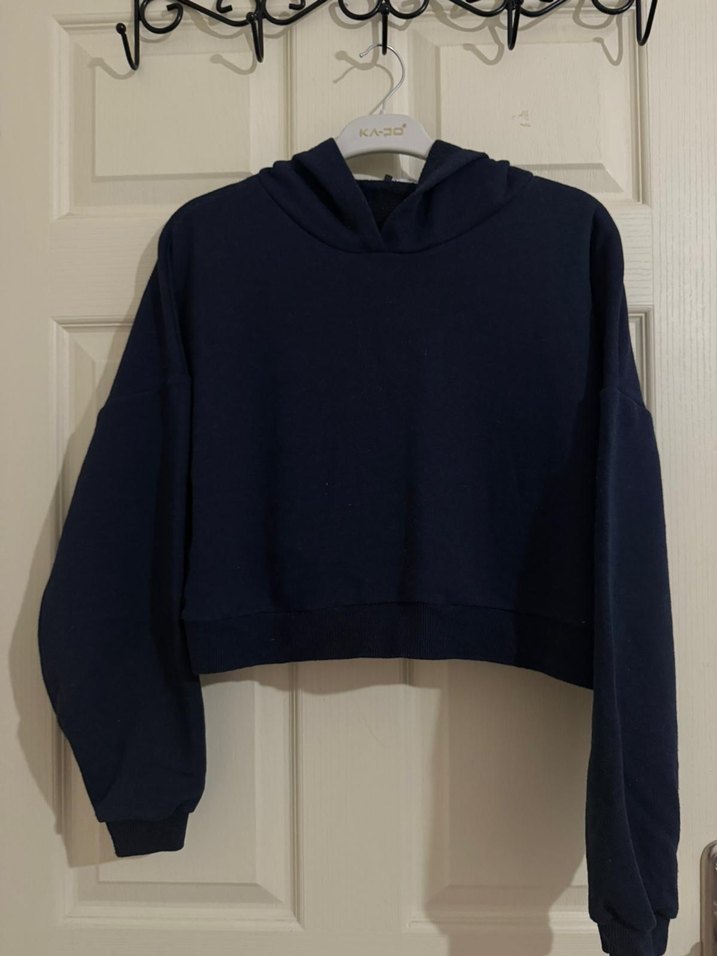 Kadınlar için uzun kollu, kapüşonlu, koyu mavi renkli, yumuşak ve sıcak kumaştan bol kesim sweatshirt. Rahat sokak stili için uygun.