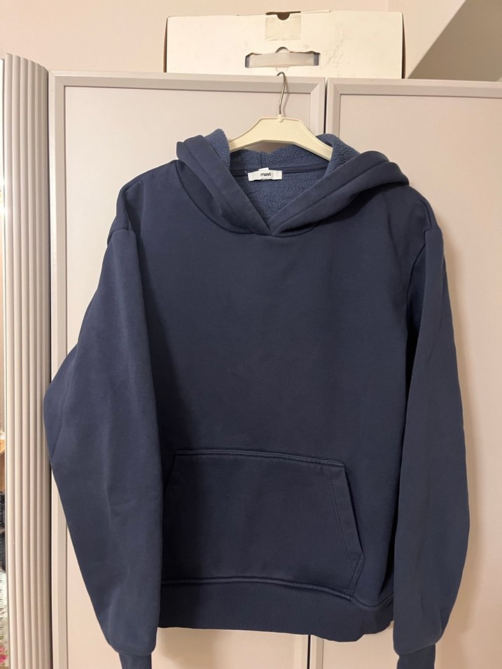 Kadınlar için kapüşonlu, bol kesim ve yuvarlak yakalı sweatshirt. Yumuşak, sıcak kumaştan üretilmiş, koyu mavi renkte ve desensiz tasarımıyla günlük kullanım için uygun.