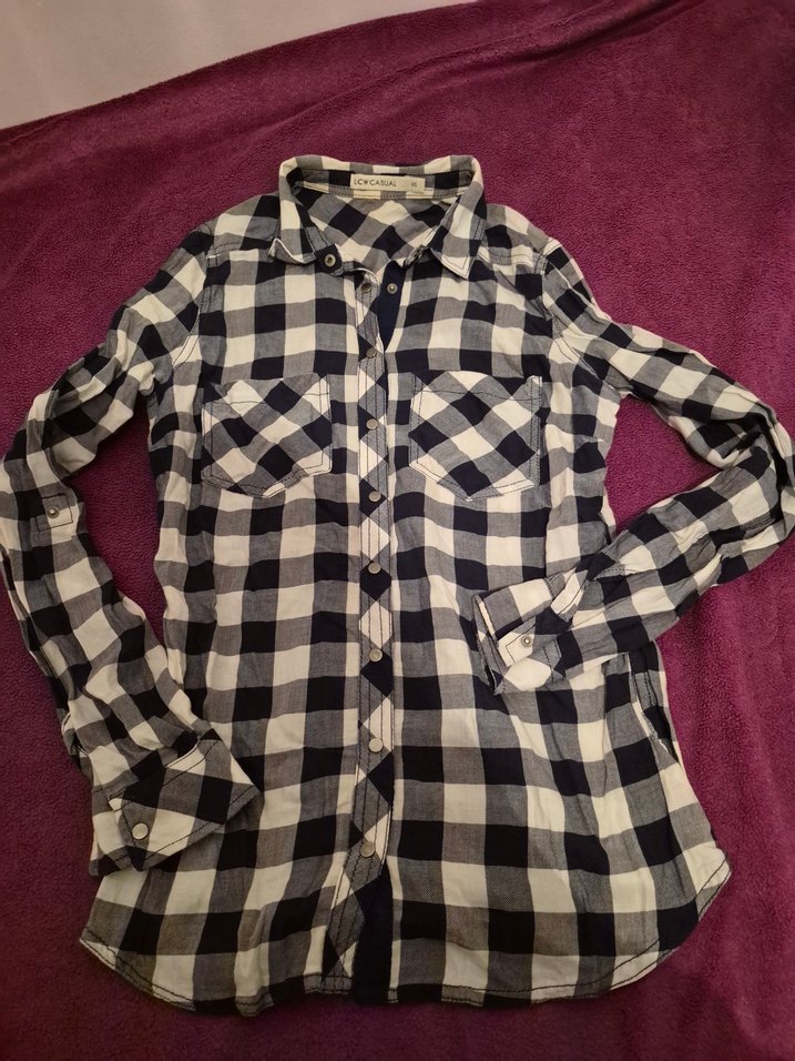 lacivert kareli, uzun kollu, pamuklu kumaştan, düğmeli ve cepli gömlek. Günlük sokak stili için uygundur.1-2 defa giyilmiştir yeni gibi
