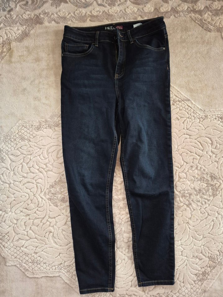 Lacivert renkli, kemerli ve bol kesim kadın jean. Midi boyda, desen içermeyen rahat ve günlük kullanıma uygun jean pantolon.