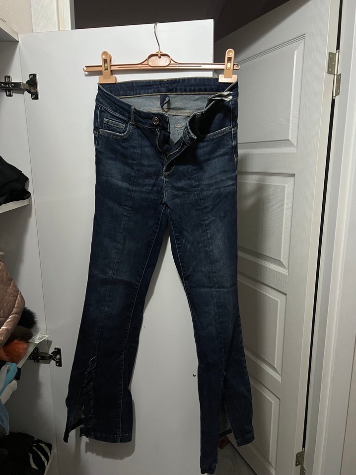 Lacivert renkte, dar kesim, kemerli ve midi boy kot pantolon. Günlük rahat sokak stili için uygundur.