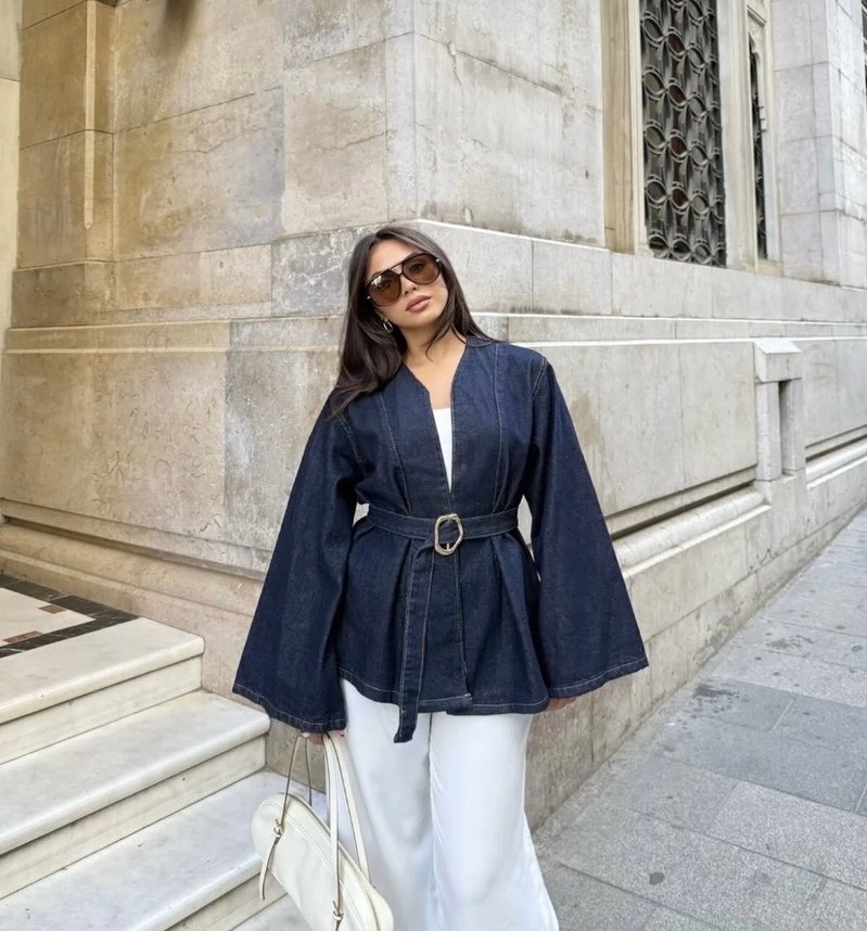 Lacivert renkte, bol kesim ve notched yaka detaylı uzun kollu denim ceket. Kemerli bel detayı ve midi boy uzunluğuyla günlük kullanıma uygun.