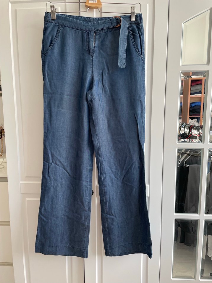 Kadınlar için lacivert renkli, kemerli, bol kesim ve midi boy kot pantolon. Desensiz ve normcore tarzda, ofis için uygundur. Jean kumaşından lacivert kumaş pantolon. Beli kendinden kemerli.boru paça,şık duruş. Bacak kısmının önünde metal para büyüklüğünde çok hafi if renginde açılma vardır. Ancak Dikkatli bakıldığın da farkedilir. Boy 97cm bel 79 cm dir. Bütün giyim ürünleri toplu satışa açıktır