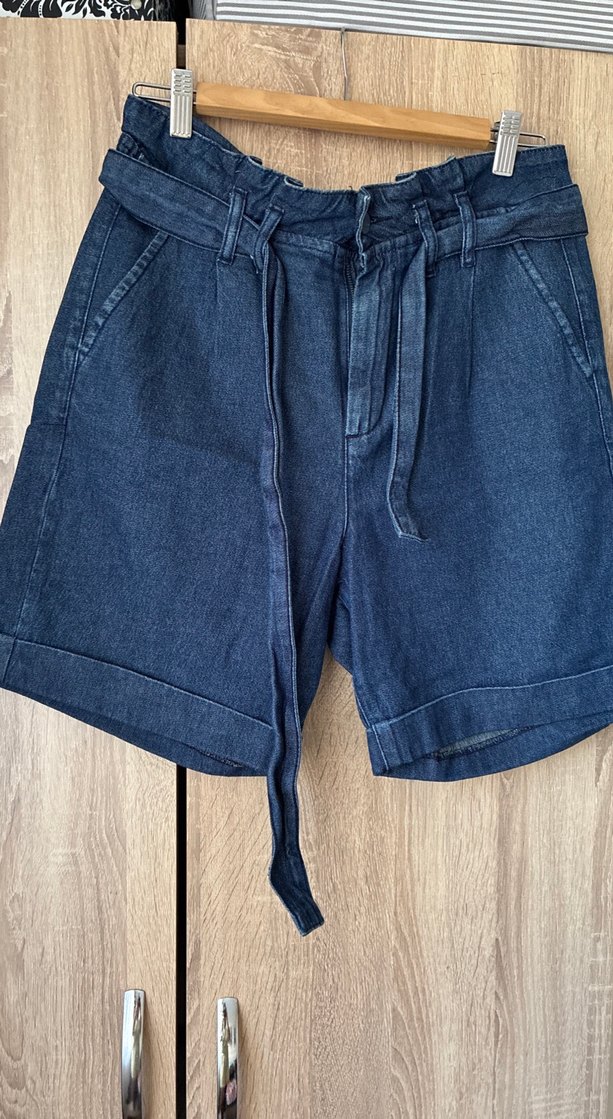 Lacivert renkli, kemerli ve bol kesim kadın denim şort, günlük rahat kullanıma uygundur.